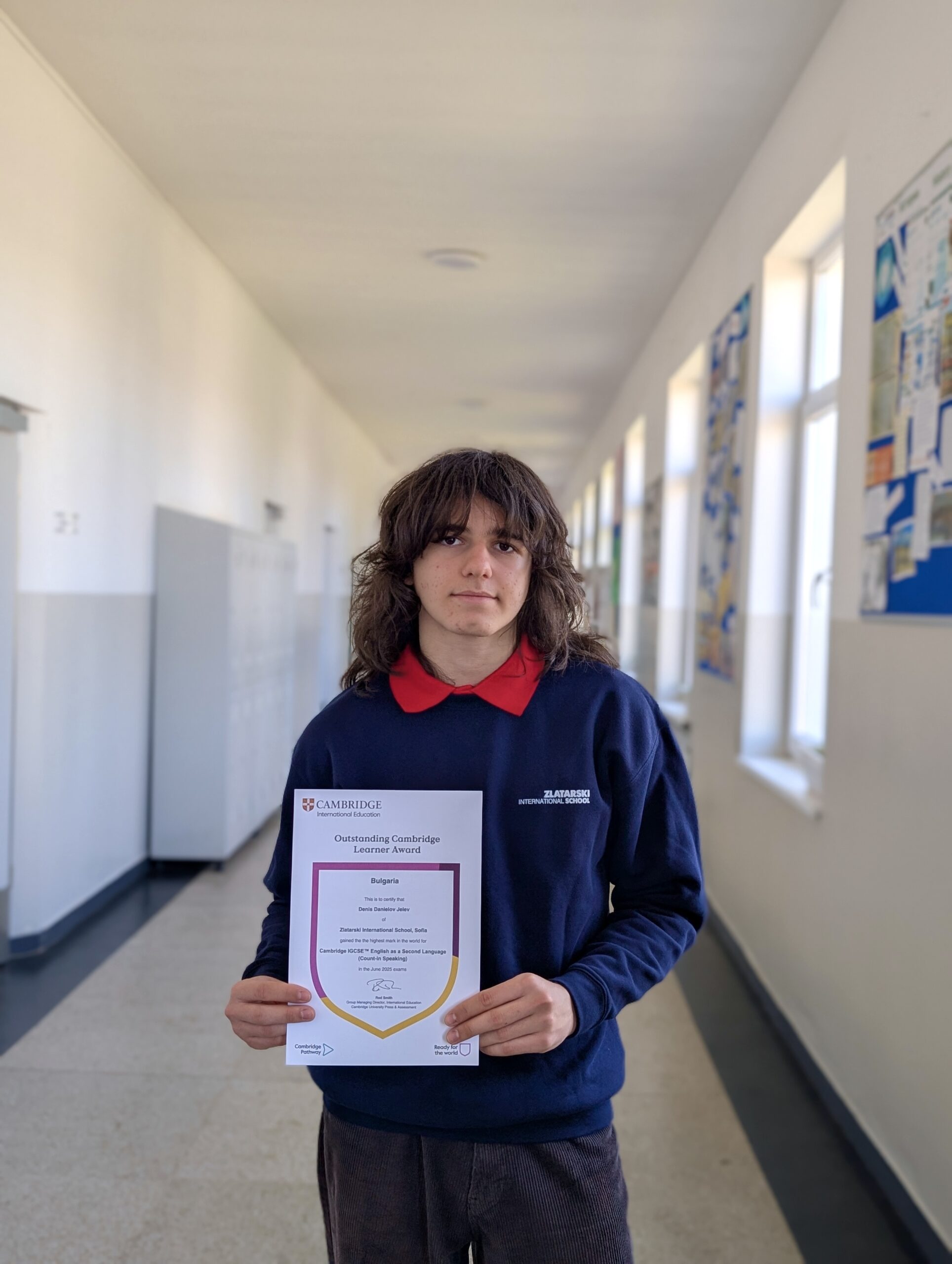 This is the first time a Bulgarian student receives the ‘Top in the World’ award. Zlatarski International School has been teaching the Cambridge IGCSE programme in Bulgaria since 2010 and more than 600 students has successfully received their Cambridge IGCSE certificates. ‘Top in the World’ refers to the learner who has gained the highest standard mark in the world for a single subject. In this case, Denis Jelev from Bulgaria received the highest mark in the world for Cambridge IGCSE English as a Second Language.